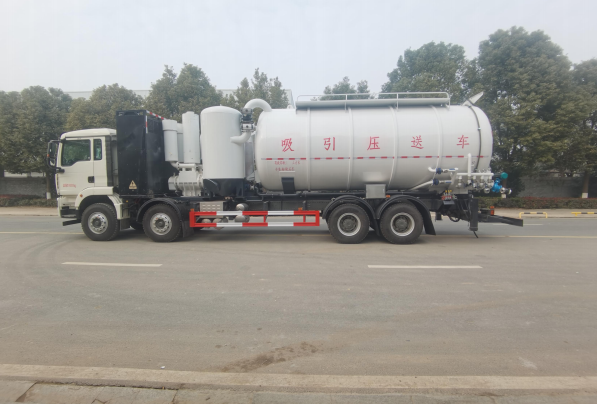 吸引压送车适用于除尘灰在硬化平坦道路上作业转运。车辆作业时采用负压(料仓条件具备时可采用正压)装料、正压排料形式(紧急情况举升开后盖倾卸);经过过滤的含尘空气达到国家环保排放标准。