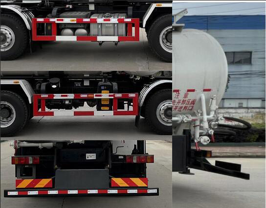 | 整车说明: | 该车装有罐体、空压机、真空泵、举升油缸等专用装置,通过真空泵产生负压对粉粒物料进行真空吸引装料,利用空压机正压卸料;顶部封闭不可开槽,后部不可开启;罐体总容量:21.66立方米,有效容积:21.2立方米;罐体外形尺寸(直径×总长)(mm):2300×6818;运送介质为:熟石灰粉,密度:550千克/立方米;侧防护所用材料材质为Q235,与副车架螺栓加焊接连接;后防护所用材料材质为Q235,与汽车大梁螺栓连接,后防护断面尺寸(mm):120×50,离地高度为450mm;仅采用轴距(mm):1800+3800+1350;随底盘选装限速装置,限速89km/h;ABS系统控制器生产企业/型号为采埃孚商用车系统(青岛)有限公司/4460046300.后轴仅采用钢板弹簧悬架改装. | ||